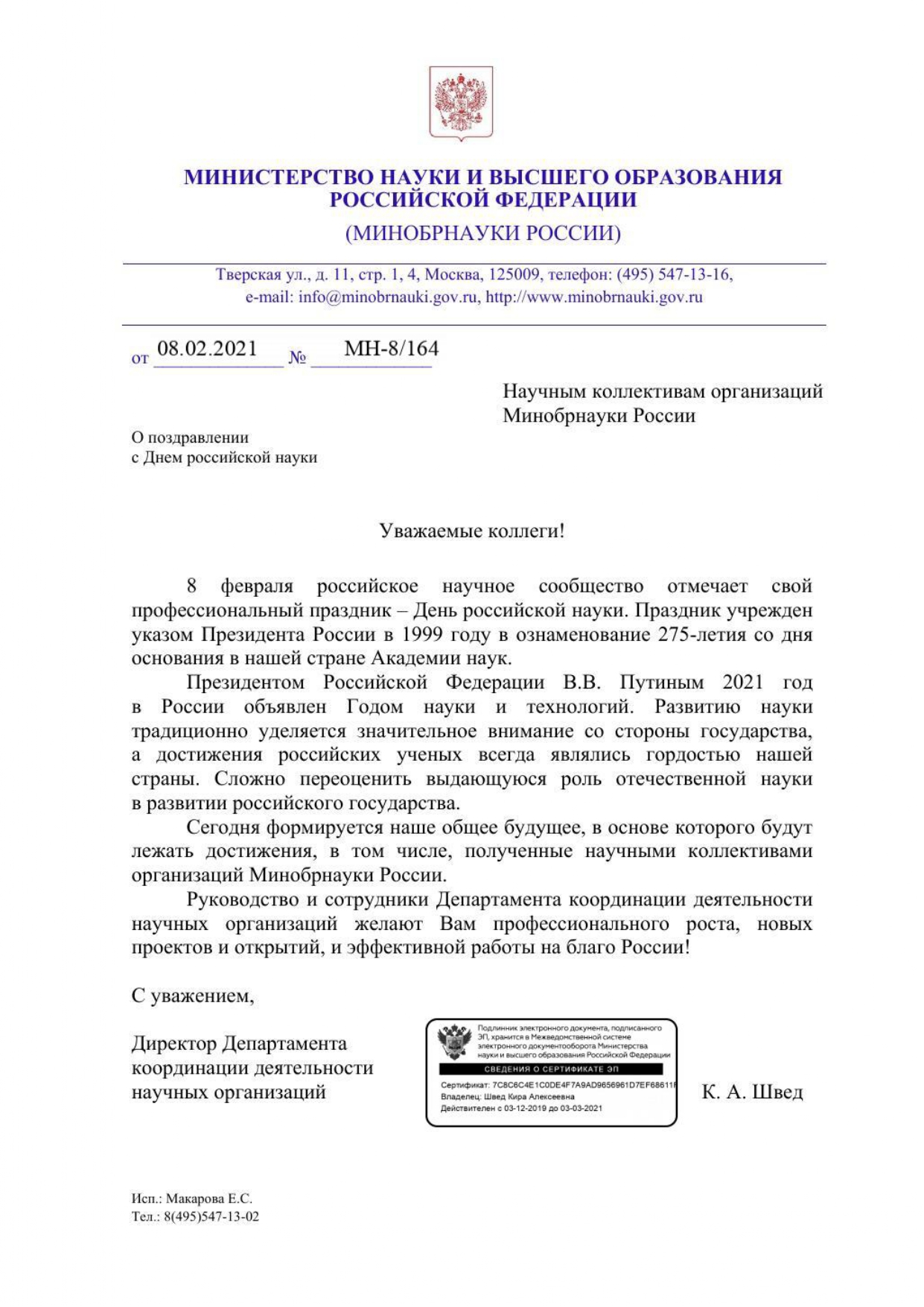 Поздравление с Днем российской науки от Департамента координации деятельности научных организаций Минобрнауки России