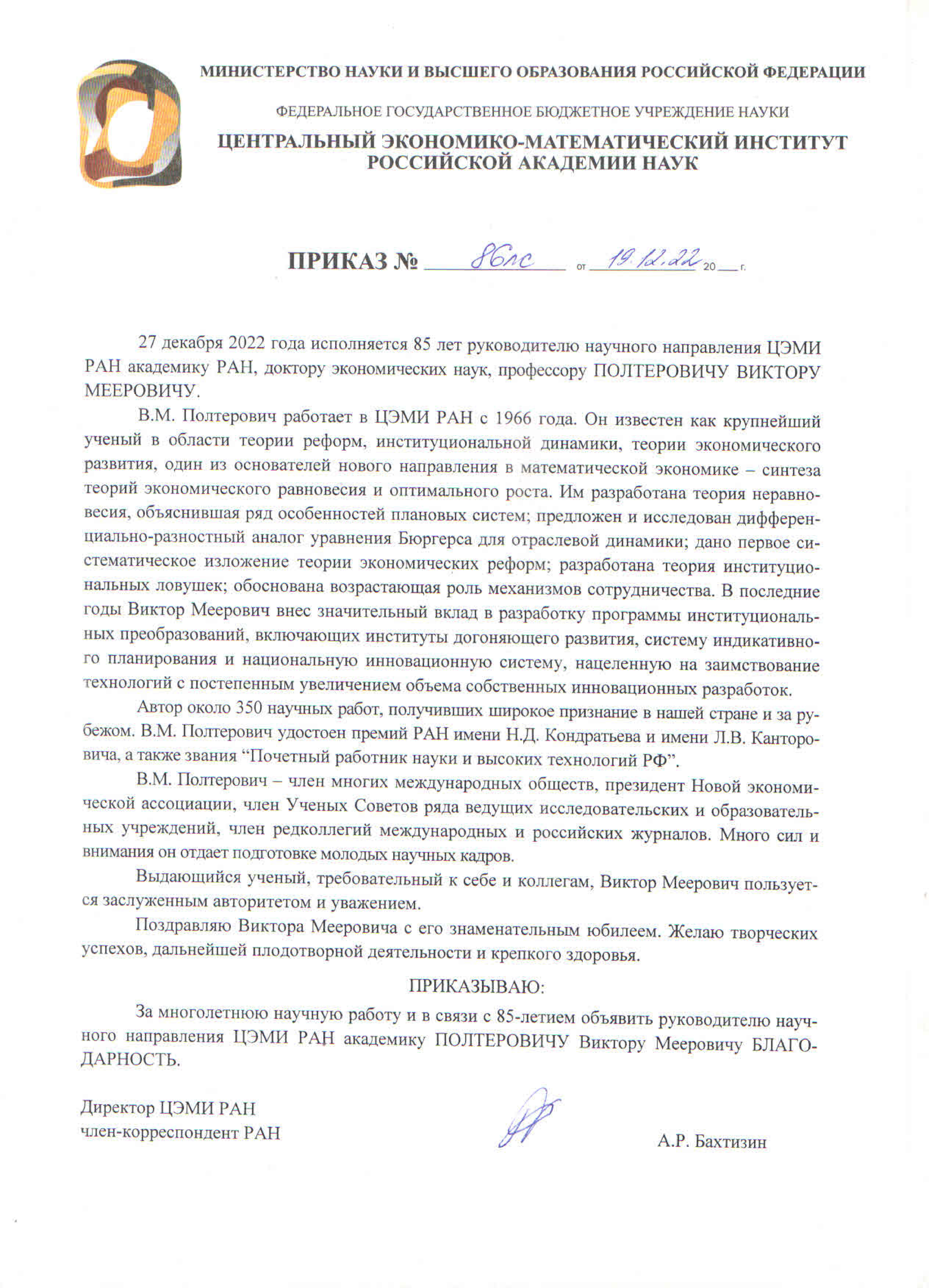 Коллектив Центрального экономико-математического института РАН сердечно приветствует и поздравляет Вас со славной Юбилейной датой. К этой вершине Вы поднялись в ореоле замечательных научных достижений, которыми отмечены вся Ваша жизнь и деятельность.